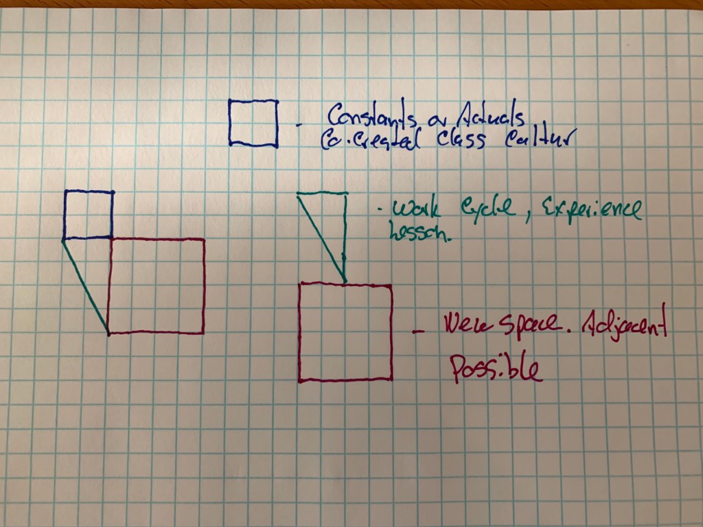 So, we wondered aloud. What does this deep dive into lemon seeds have to do with Karla’s Caterpillar? We started to see the special right triangle as a wedge, a work cycle that opens new space. We have or know or are able to do something new as a result of that work cycle. These events and sub-events don’t unfold randomly. They are dependent on constants, actuals-the square. Within this square are those cultural rituals and routines we have put in place. Evolutionary biology teaches that those actuals change and adapt, but the work cycles and emerging future (Scharmer) are intimately connected to the square!