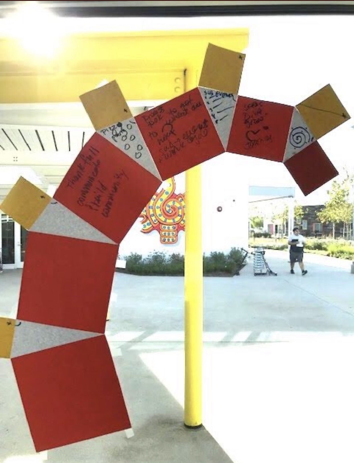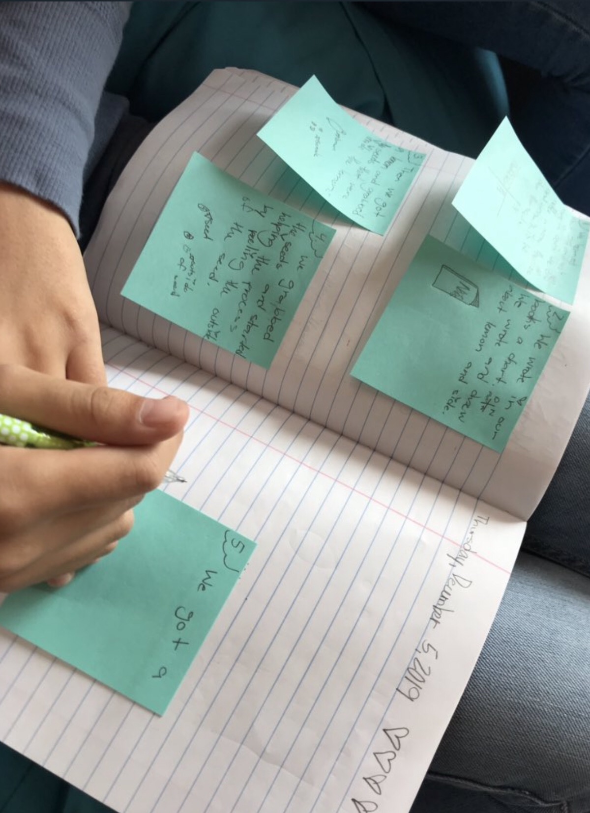 Accidentally or coincidentally, Dr. Puglisi arrived one day with a stack of post-its and a challenge. Could we slice this square into five equal parts? Could we slice this triangle into five equal parts? Squares and triangles in the post-it note challenge. Squares and triangles in Karla’s caterpillar. The early connections were obvious? Tentative? Enough to keep exploring.